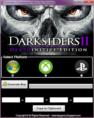 Hi,welcome to best-keygens.blogspot.com, Are you looking for Darksiders II Deathinitive Edition Key Generator without surveys and without the use of a password? If you are looking for Darksiders II Deathinitive Edition Key Generator free do not worry you will give to you for free. Tool keygen is 100% clean from viruses. Here you will get a serial key or cd key for the game on your PC, Xbox One, Xbox 360, PS3, PS4.This key generator contains more than 20,000 serial numbers for you so that you can give some to your friends that had this program all along but couldn’t play because they didn’t had the serial number.This keygen is updated every week with new serials so you don’t have to worry if you would want to use it later in time.The key is always generated quickly by connecting to our servers.Ok please do not hesitate to download Darksiders II Deathinitive Edition Key Generator here.Enjoy it!